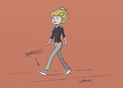This girl looked a bit like a short Jessica Alba, with a big wad of multicolored hair filling out her head. Her shoes were dark red and very sparkly. I couldn't give this one much love, but wanted to at least get the impression down.